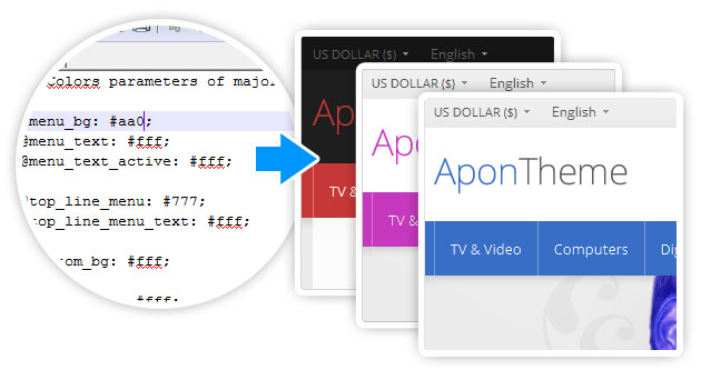The color of some major elements of the theme are in one place in LESS file color variables. For instance, if you change the color of the menu background via only one variable, the border of the menu, its separators and all the subcategories will be changed in appropriate color either. Even some other color of elements, such as some headings and main sidebox badges will change the color automatically.