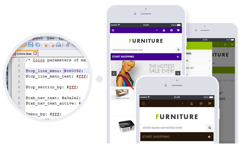 The color of some major elements of the theme are in one place in LESS file color variables. For instance, if you change the color of the menu background via only one variable, the border of the menu, its separators and all the subcategories will be changed in appropriate color either. Even some other color of elements, such as some headings and main sidebox badges will change the color automatically.